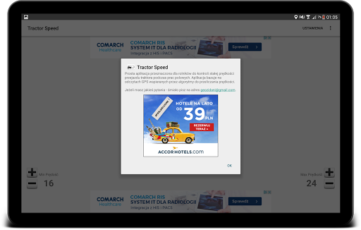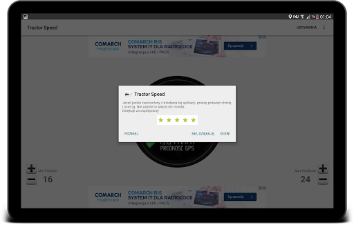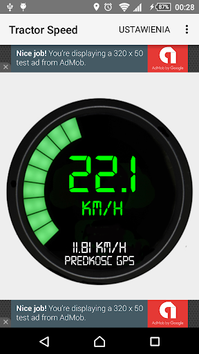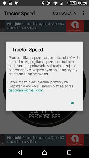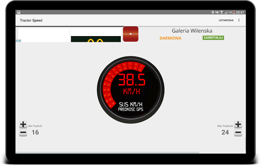 Prędkościomierz obliczający prędkość na podstawie sygnału GPS pracy traktora. Aplikacja pozwala na utrzymanie stałej prędkości pracy maszyn rolniczych i kontroli odchyleń szybkości przejazdu w trakcie prac polowych. Prędkość ciągnika jest wyznaczana na postawie częstych odczytów sygnału GPS a następnie przeliczana dla otrzymania wiarygodnych i aktualnych wartości.
