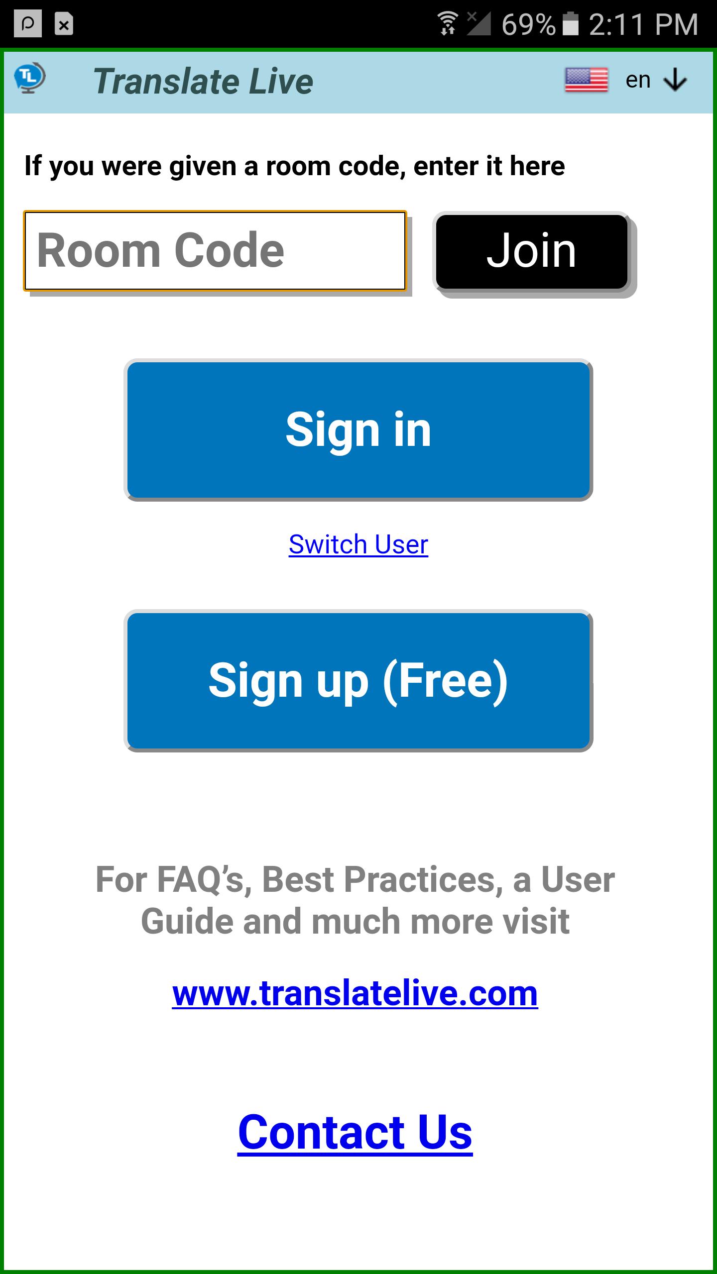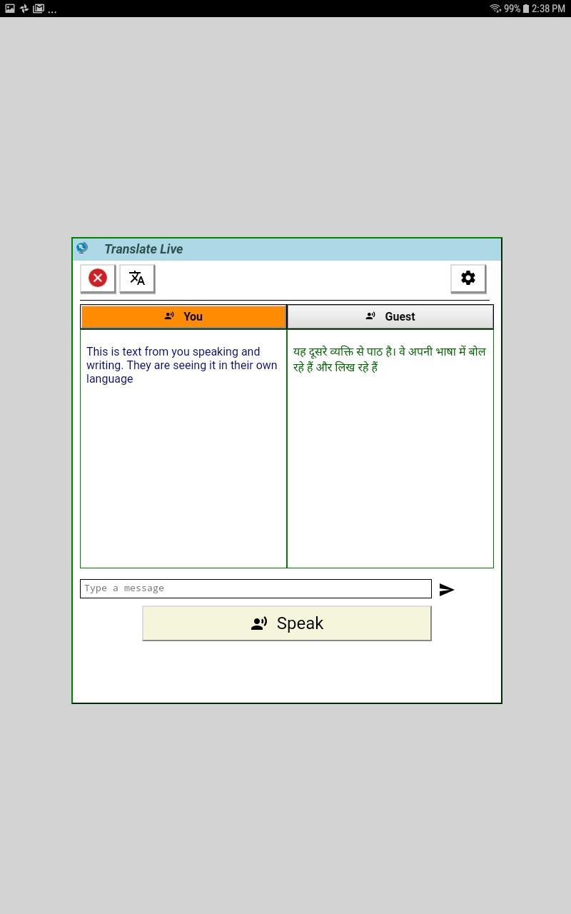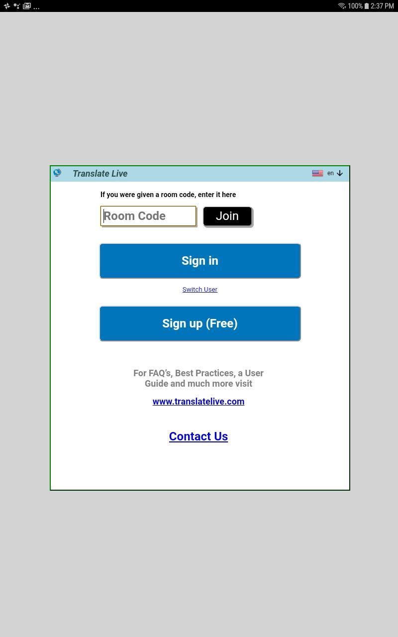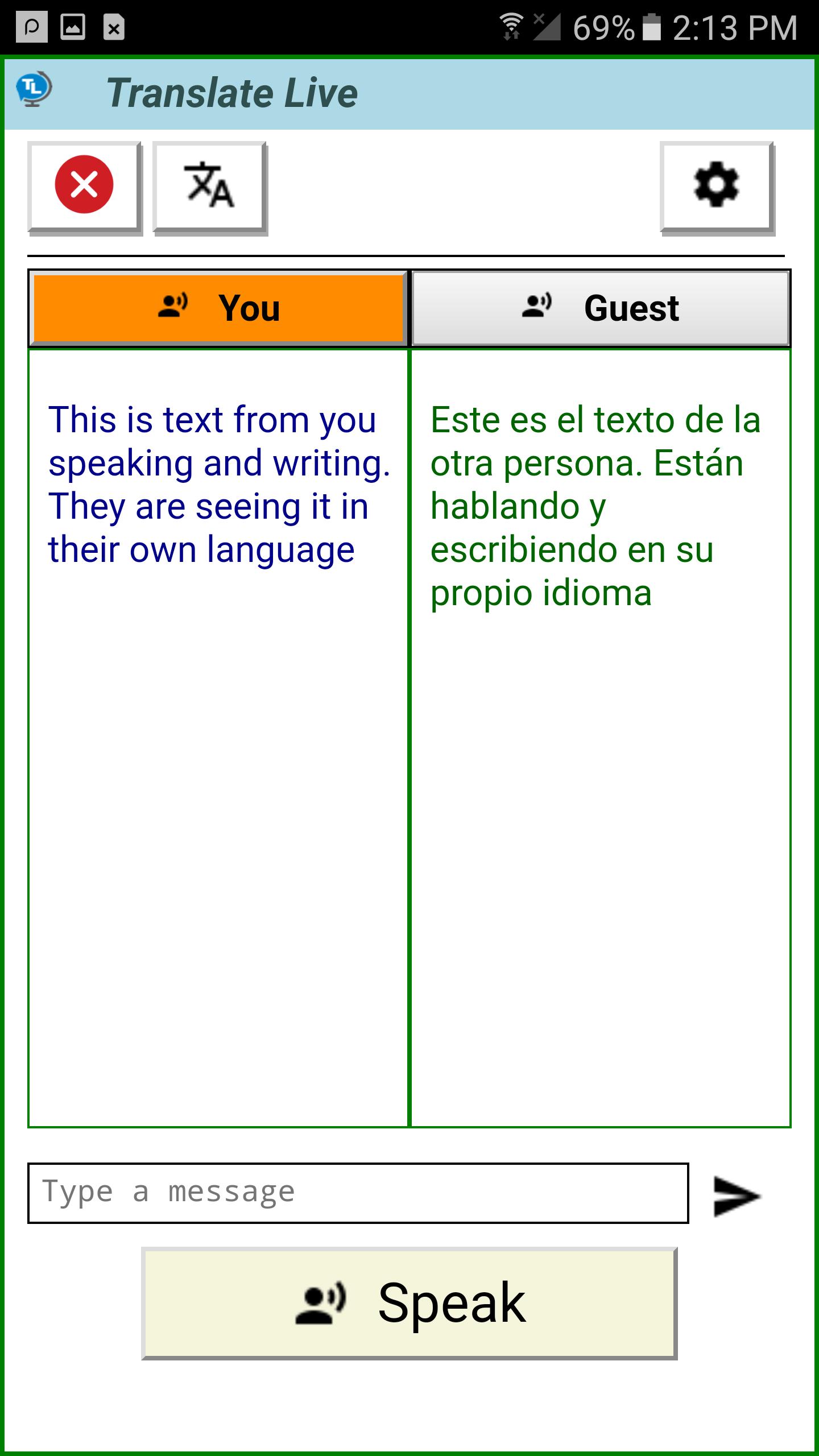 TranslateLive allows you to have a live translated conversation with anyone in the world in over 120 languages using any smart phone or computer. Using cutting edge AI, TranslateLive enables anyone to easily connect (single click room) to another person, turn each persons voice into text, translate that text and display it to the others person in real time. TranslateLive allows you to see your own text so you can correct it by re-speaking, spell it out loud or type and have it translated to the other person.