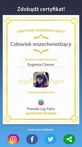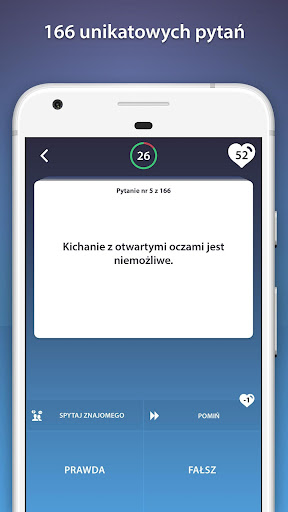 Jeśli jesteś entuzjastą ambitnych quizów z trudnymi pytaniami, dołącz do „quizzerów“ z całego świata w tym zabawnym turnieju quizowym. Poznaj fakty, w których prawdziwość nigdy byś nie uwierzył! Ten quiz wiedzy to cała gama kategorii w jednej aplikacji: quiz z kultury (popularnej i wysokiej), quizy o zwierzętach, nauce, historii, gry geograficzne... można by wymieniać w nieskończoność. Masz gwarancję, że ten quiz wiedzy przypadnie Ci do gustu. Gra Prawda czy Fałsz to skarbnica ciekawostek, którymi możesz zaimponować znajomym. Pobierz quiz Prawda czy Fałsz i bierz się do zgadywania!
