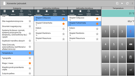 Konwerter jednostek firmy Aevumsoft łączy łatwość obsługi z potężnym zasobem funkcjonalności. Zawiera on ponad 2000 jednostek w 90 kategoriach. Jednostki i kategorie są dostępne poprzez łatwy w użyciu, profesjonalny interfejs użytkownika, który został zoptymalizowany dla telefonów i tabletów.