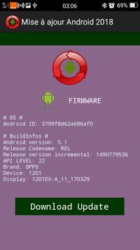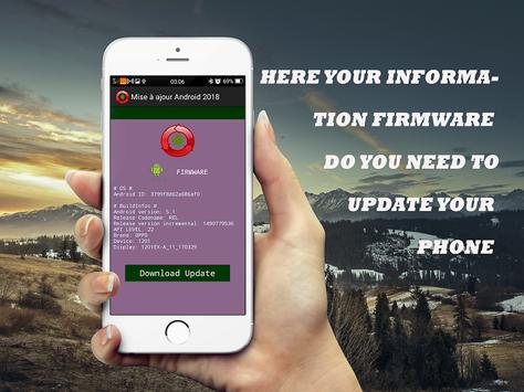 This Application all first detects the references of your smartphone tablet such as RAMAndroid version the current firmware and also the internal memory of your SmartphoneBut the main role is to analyze your system and give you the latest version of Android firmware, upgrade and simple Smartphone update also end tablet all devices uses the Android versions.It is you have started an update of such software is you do not have time to do it on the spot this application detects this type of update it does it automatically.Since there are several versions of Android this application you can used it to choose your version that goes well with your Smartphone and rather the latest Android versionSo here are the features Android firmware compatible with this update: Android ™ Nougat, version 7.0; Android ™ Marshmallow, version 6.0; Android ™ Lollipop, version 5.0; Android ™ Kitkat, version 4.4; Android ™ JellyBean, version 4.2; IceCream Android ™, version 4.0; Android ™ Honeycomb, version 3.0; Android ™ Gingerbread, version 2.3; Android ™ Froyo, version 2.2; Android ™ Eclair, version 2.1; Android ™ Donut, version 1.6; Cupcake Android ™, version 1.5;Smartphone analysisTablet and Phone UpgradeUpdateDetects compatible firmwareDownload new version AndroidFixes software bugsDiscover new updateUpdate the phone simplyAndroid versionLatest Android version