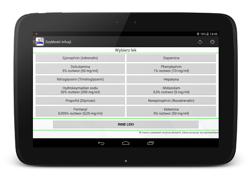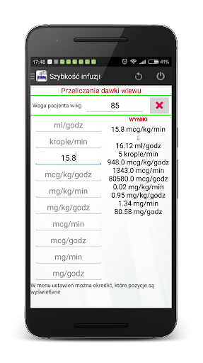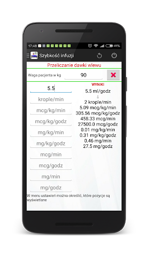 Program pozwala na obliczenie szybkości infuzji leków. Zamiana z ml/godz na mg/min, mg/kg(lb)/min, mg/kg(lb)/godz, mg/godz, mcg/kg(lb)/min, mcg/kg(lb)/godz, mcg/godz jest szybka, prosta I wymaga tylko kilku klikniec. W ustawieniach mozesz wybrac mase ciala w kilogramach lub lbs (w UK)