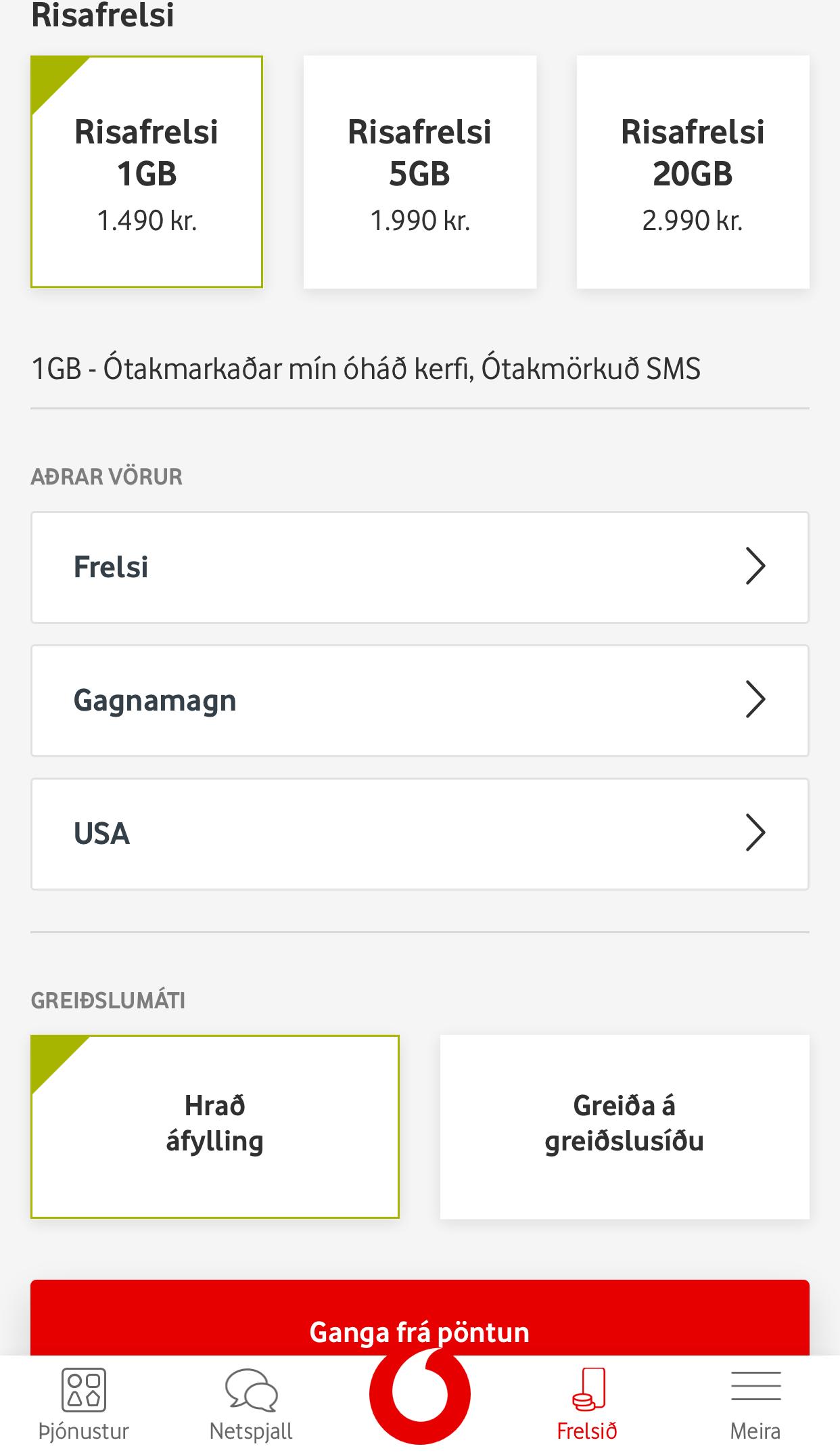 - Keypt inneignir og gagnamagn fyrir frelsisnúmer og 4G netfrelsi með greiðslukorti eða með hraðáfyllingum.