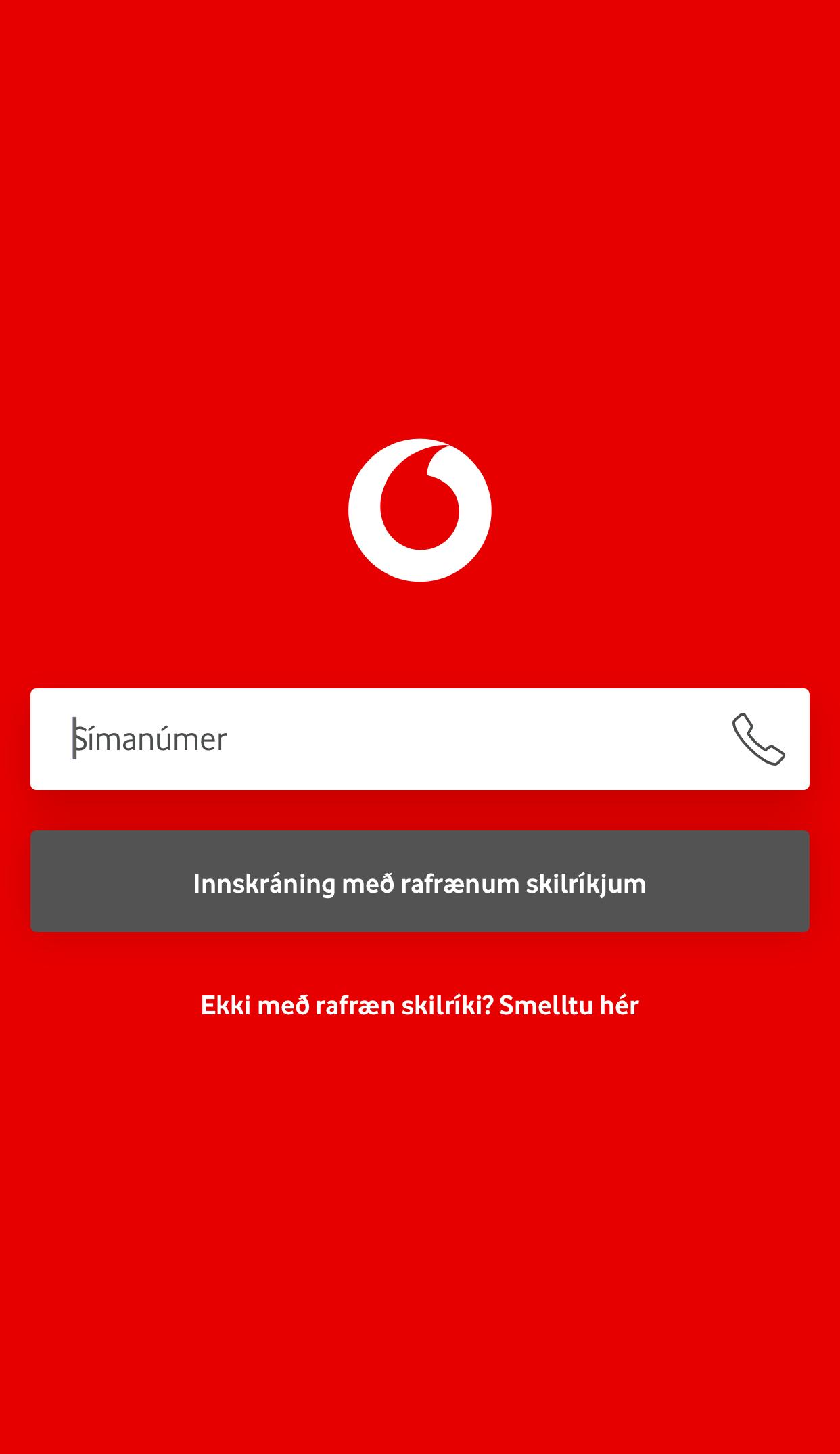 Í Vodafone appinu sérðu upplýsingar um alla þína þjónustu hjá Vodafone og notkun hennar. Hægt er að innskrá sig í appið með rafrænum skilríkum eða með símanúmeri og SMS.