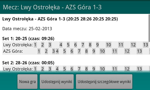 Po zakończonym meczu możesz przesłać wynik na maila lub smsa, ewentualnie udostępnić przez BlueTooth lub na serwisach społecznościowych.