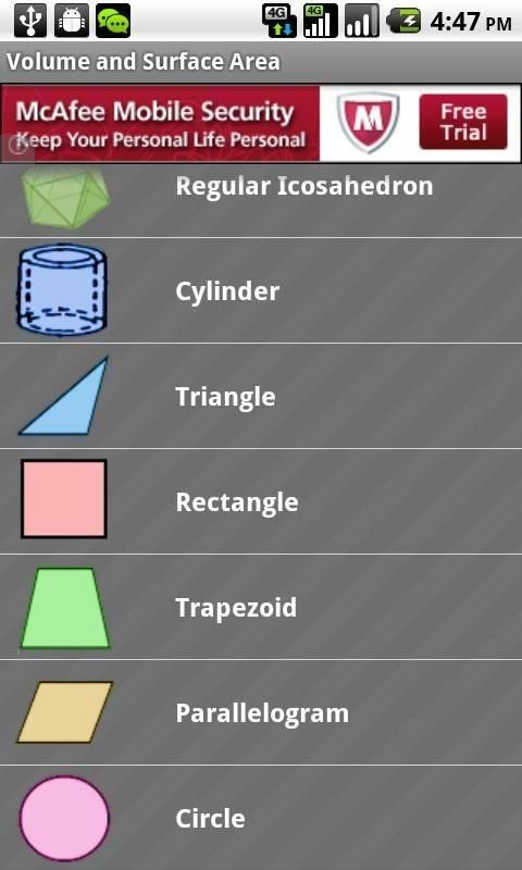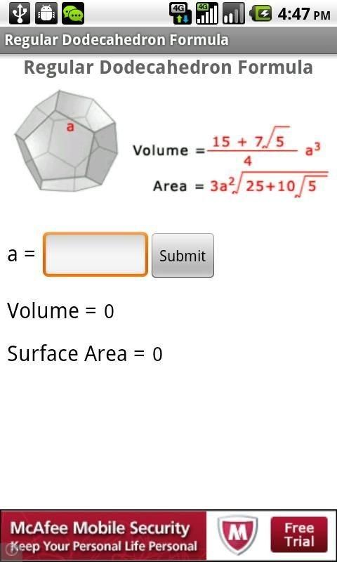 Volume and Surface Area Calculator 1. Cube 2. Rectangular Solid 3. Sphere 4. Pyramid 5. Cylinder 6. Cone 7. Cone Frustum 8. Torus 9. Ellipsoid 10. Regular Dodecahedron 11. Regular Icosahedron 12. Cylinder 13. Triangle 14. Rectangle 15. Trapezoid 16. Parallelogram 17. Circle V 1.0.4 Bug fix V 1.0.3 Add more volume and surface. V 1.0.2 Bug fix force close problem.