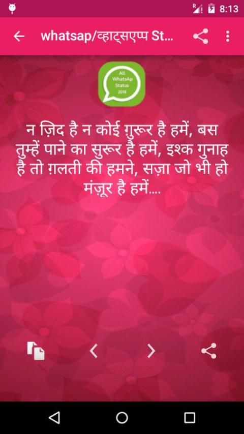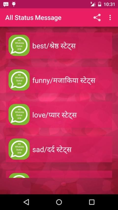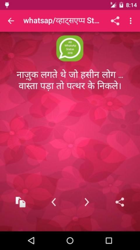 Nice and large collection of whatsap Status message that is completely offline and free .It contains 10000+ Status to update your whatsap status regularaly . This app contains hindi status and english status