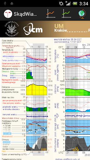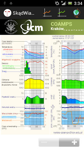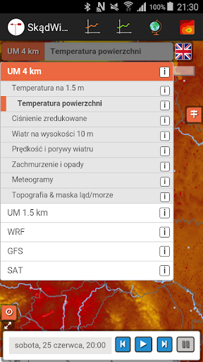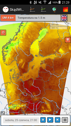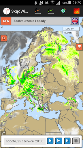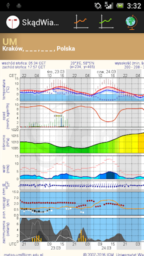 Trzema guzikami na pasku tytułowym możemy zmienić model prognozowy i przejść do mapy, aby określić nową lokalizację przytrzymując palec na wybranym miejscu.