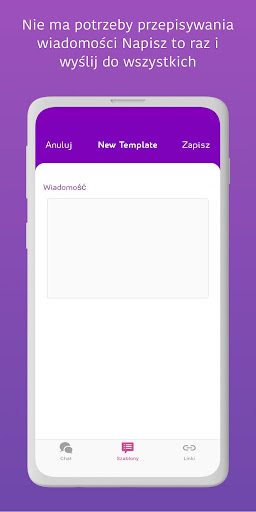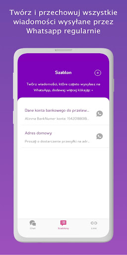 • Zapisywania szablonów wiadomości, jakie często wysyłasz przez WhatsApp. Zapisuj je w WtsAppy jako notatki, które można potem udostępnić na WhatsApp w dowolnym momencie za pomocą jednego kliknięcia. Tak, tylko JEDNEGO kliknięcia! Szablony mogą zawierać twój kod pocztowy, twoją lokalizację albo numer konta bankowego.