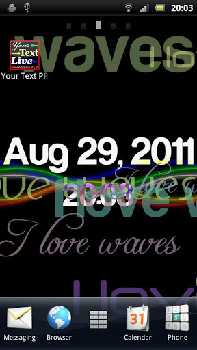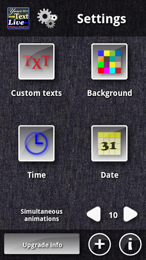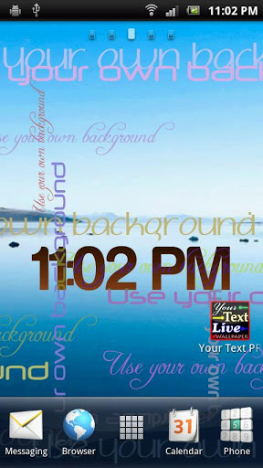 Fill your screen with mesmerizing moving textsCheck out Your Text LW PRO. IT39;S FREE NOWFill your screen with mesmerizing moving texts with one of the most customizable live wallpapers in the market Try it It39;s a free demo Enjoy trying combinations finding your own style Put the name of your favorite sports team, your partner, your company, your pet, an event, or just your favorite words. Fully customize each text selecting colors, sizes, fonts, animations ... Choose the background you like among the available types of backgrounds or use a custom image see FAQ. You can choose to display the date andor time with the fonts and colors you want. If you like to often change the look of the wallpaper, you can create a shortcut to the settings for this live wallpaper to edit them quickly. See screenshots and FAQDEMO VERSION This is a free trial: You can fully customize one text only, the other three texts can not be disabled and they are not fully configurable. You can buy the unlimited PRO version for less than the price of a coffee.F.A.Q. Q: How do I open this app?, it doesn39;t appear in the list of applications A: This is not a typical application, this is a live wallpaper. To use it, press the menu key in the home screen gt; select wallpapers gt; select live wallpapers gt; Select Your Text LW at the end of the list. Q: Can I use a custom image as the background of the texts? A: Yes. First, set the picture that you want as the wallpaper of your device, then activate Your Text Live Wallpaper and use Settings gt; Background gt; select quot;Use my current wallpaperquot; Q: How much battery power uses this live wallpaper? A: A priority in the development of this wallpaper has been minimizing the battery usage. Is highly optimized and only works when it is visible, not using power at all when it is not visible. Q. What39;s the use of the shortcut to the settings? A: The shortcut is used to edit the settings for this wallpaper with just one click. Note that if this wallpaper is not your current wallpaper, you will not see the changes until you select it as your wallpaper. Q: How do I set the shortcut to the settings? A: The way may vary slightly between devices, but usually you can do that pressing for one second on a free area of the desktop, then select shortcuts, and select quot;Your Text LW Settingsquot;. The shortcut will appear on your desktop.IMPORTANT: Send us an email if you have any questions, problems or suggestions. There is no way to answer to the comments on the Market.