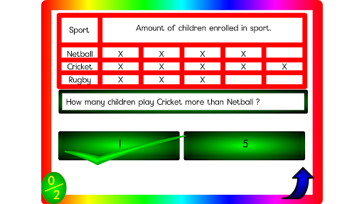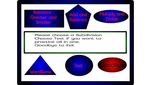 Uczeń ma wybór, którego można wybraćprzykładowy test lub skoncentrować się na niektórych kategoriach, takich jak: 1: Większa niż lub mniejsza niż, 2. Dodawanie i odejmowanie, 3. Mnożenie i podział lub 4. Problemy ze słowami.