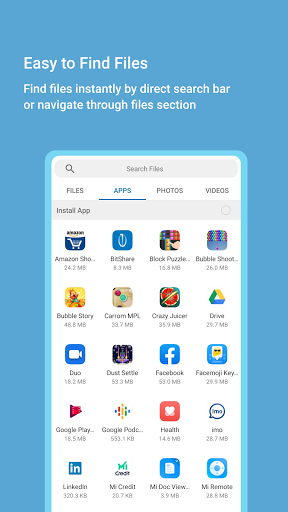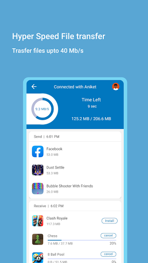 • Udostępniaj zdjęcia, filmy, Muzyka, zainstalowane aplikacje, APKS, Foldery i wszelkie inne pliki szybko pomiędzy dowolnymi urządzeniami mobilnymi w dowolnym miejscu i dowolnym miejscu z prędkością 40 Mb / s .