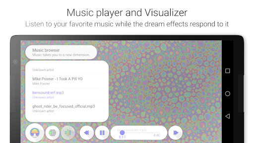 Wbudowany odtwarzacz muzyki i wizualizer umożliwiają granie swojej ulubionej muzyki i sprawić, że muzyka zmienia sen. Działa w czasie rzeczywistym, wykrywając Bass, Mid and Treble Notes w aktualnie grającym piosence. Wpływ senów są bezpośrednio pod wpływem tych notatek i w pełni konfigurowalny.