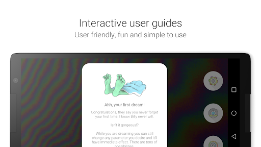 Używa aparatu telefonu do tworzenia doświadczeń wizualnych w czasie rzeczywistym dla użytkownika z niesamowitą jakością i szybkością. Psychodeliczny sen został opracowany z myślą o bezpiecznym i zabawnym doświadczeniu wizualnym dla każdego, kto jest właścicielem odpowiedniego telefonu z Androidem.