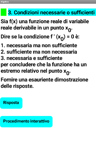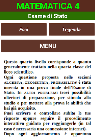 Questo quarto livello corrisponde a quanto generalmente trattato nella quarta classe del liceo scientifico. Ogni questione proposta nelle sezioni ALGEBRA, GEOMETRIA, PROBABILITÀ è stata inserita in una prova finale dell’Esame di Stato. In ALTRI PROBLEMI trovi possibilità ulteriori di preparazione, per stimolo allo studio o per mettere alla prova le abilità che hai già acquisito. Puoi scrivere e controllare subito le tue risposte oppure seguire il procedimento interattivo guidato per raggiungerle (in tal caso è necessaria una connessione internet).