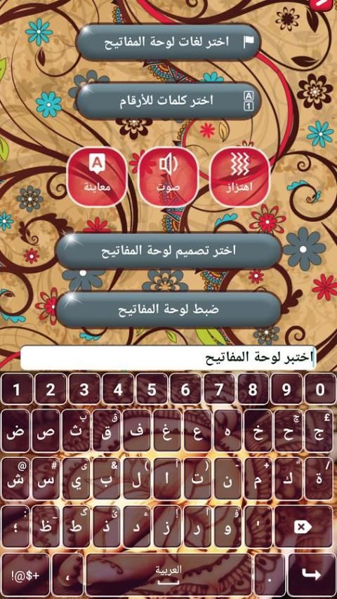 Say goodbye to the suffering of writing traditional methods of decoration with Download This Arabic keyboard on your phone typing emoticons and get decorated Arabic Keyboard Professional. Start now and theme Arabic keyboards and enjoy bright colors and distinctive type text messages with "Hanna Patrnz wears Keyboard." You can change the shape of Kpjord decorated Arabic inscriptions new range of exquisite henna adorn your dazzling shapes, we recommend you to download now and theme Arabic Keyboard Keyboard most attractive and elegant with brilliant inscriptions henna.