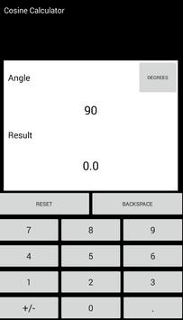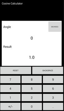 Cosine calculator is a helpful education tool. It makes it easy to calculate the cosine of any angle. Cosine calculator lets you use both radians and degrees. In addition cosine calculator remembers your last calculation!