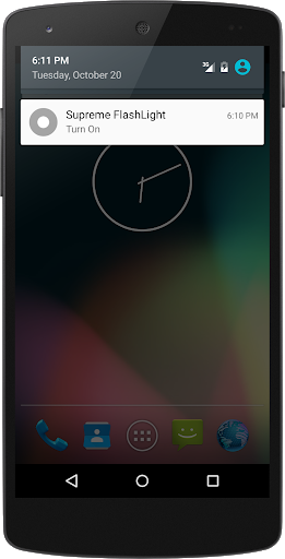 Turn on the flashlight from notification bar! Automatic on when application starts Write messages or make other action without turn off the flashlight Turn off touching the flashlight