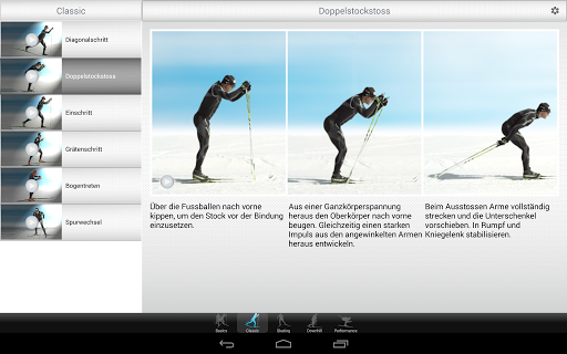 Technika narciarstwa jest szczególnie odpowiednia dla liderów i autokarów, ale także dla wszystkich ambitnych biegaczy, którzy chcą poprawić swoją technikę. Krótkie filmy pokazują od kilku perspektyw, w czasie rzeczywistym, zwolnionym tempie i wsparciu graficznym, ponieważ pojedyncze typy kroków są wykonywane prawidłowo. Aby móc dokładniej studiować indywidualne sekwencje ruchowe, możliwe jest przesuwanie obrazów indywidualnie do przodu i do tyłu.