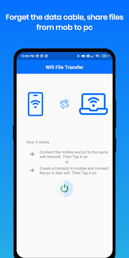 Wifi File Transfer allows you to transfer files like music, photos, videos, documents, any type of file from android device to pc via wifi network. No need of internet, just connect to the same wifi network as of pc or turn on hotspot in mobile & connect the pc to that wifi. It's enough you can share files entirely in Offline.