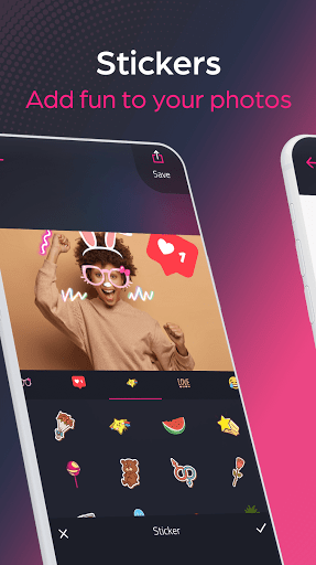 • Dodaj więcej zabawy do swoich zdjęć przez wspaniały zestaw darmowych naklejek, takich jak naklejki miłosne, śmieszne naklejki, dobre majchery i inne naklejki i inne. Możesz go znaleźć w programie Edytora Photo Pro. Możesz także dodać więcej niż jedną naklejkę do obrazu i kontrolować rozmiar i położenie naklejek.