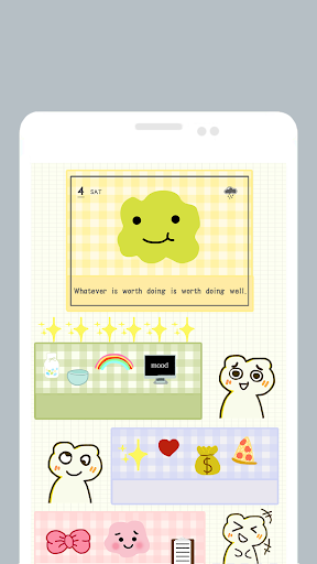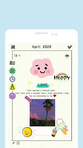 It’s your calendar, diary, notebook. There are functions like mood fonts, weather, password, sticker, sketchpad, time search, language, chart report, etc.. It can insert photos, make your own emoticons and so on.