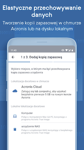 * Jednoczesne tworzenie kopii zapasowych do chmury Acronis Cloud i lokalnych komputerów Windows/Mac wymaga aktywnej subskrypcji do Acronis True Image dla laptopa/komputera stacjonarnego. Tworzenie mobilnych kopii zapasowych do NAS wymaga instalacji darmowej aplikacji Acronis True Image NAS.