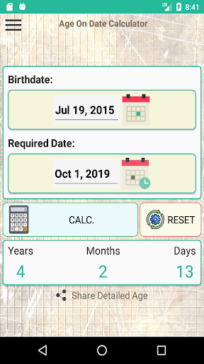 An Easy to use App to Calculate a detailed Age in (Years, Months, Days) by providing the birth-date and a specific date, super simple, and super useful in many cases such as calculating person's age, calculating child's age for school admission, calculating baby's age in months & days, and to calculate difference between two dates.