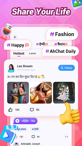 Ahchat to bezpieczna aplikacja do czatu głosowego do nawiązywania znajomości, w której możesz rozmawiać z przyjaciółmi za pośrednictwem połączenia głosowego i SMS -ów i znaleźć nowych znajomych przez połączenie głosowe.Naszą wizją jest zapewnienie użytkownikom bezpiecznej, autentycznej i interesującej platformy czatu oraz pomoc użytkownikom w rozszerzeniu kręgów przyjaźni w zrelaksowanym i przyjemnym miejscu.