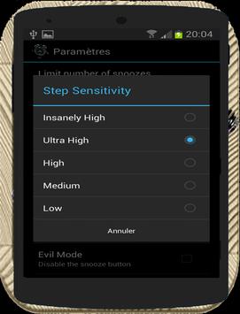 You can even have the snooze duration decrease in time after every snooze and set a maximum number of snoozes Change the sensitivity of the step counter