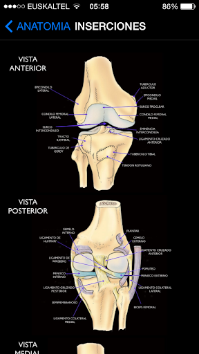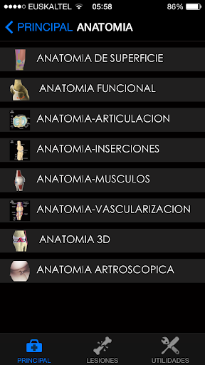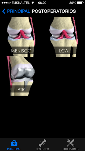 Esta aplicación contiene información de interés sobre patología de rodilla, abarcando desde las lesiones que se pueden producir en la edad infantil, hasta las que afectan al paciente adulto.