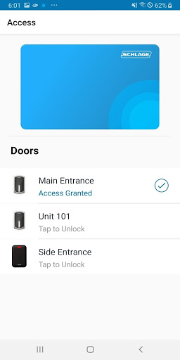 Nowy poświadczenia Schlage® Mobile Dostęp umożliwiają użytkownikom mieszkańców i końcowych, aby wykorzystać urządzenie mobilne zamiast fizycznej odznaka, aby bezpiecznie odblokować otwór. Dostępne dla telefonów z systemem Android 6.0 i więcej, aplikacja Schlage Mobile Access jest wygodna i łatwa w użyciu.