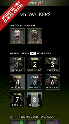 Collect up to 20 iconic walkers from the show by scanning specially-marked Mountain Dew products and by tuning in to new episodes of The Walking Dead, which premieres Sunday October 22 at 9/8c on AMC.