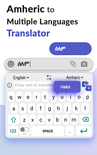 Amharic Voice Keyboard ma i ekskluzywna funkcja tłumacza Teraz możesz przetłumaczyć z Amharic na angielski i 100 języki z bezpłatnym tłumaczem. Tłumacz tekstowy jest dostępny w klawiaturze, który wystarczy wybrać języki i wpisz, aby natychmiast tłumaczyć tekst i uzyskać tłumaczenie na ekranie, aby się udostępnić.