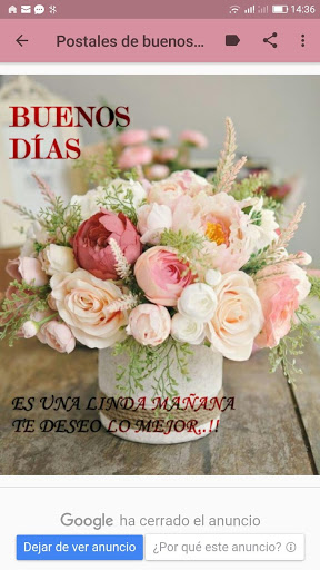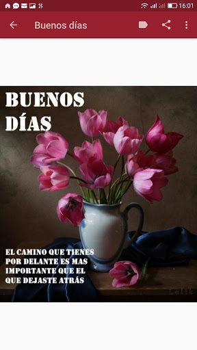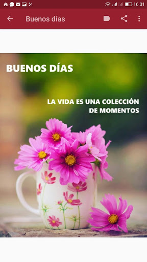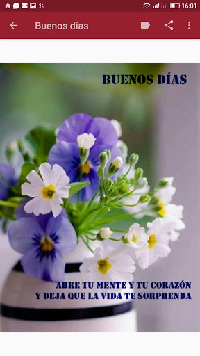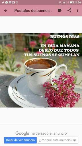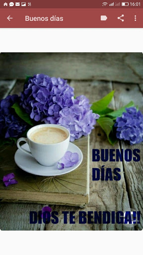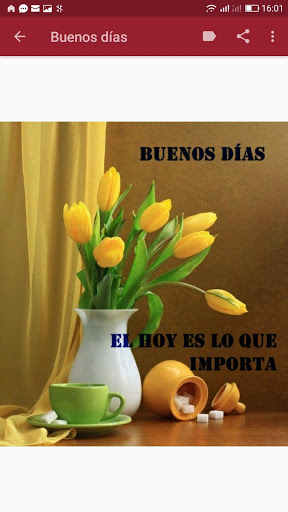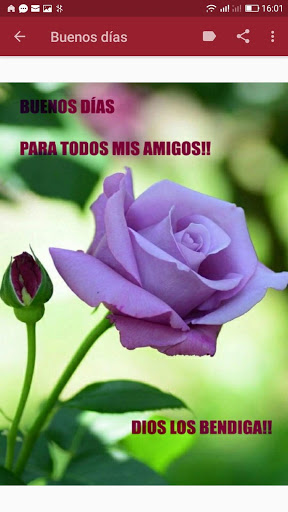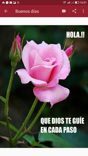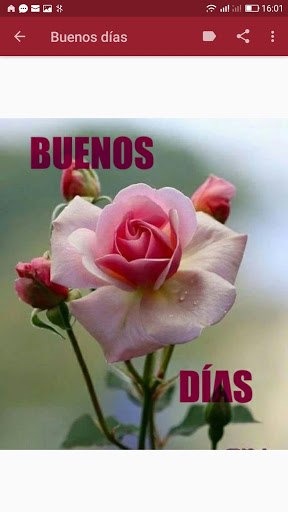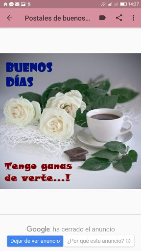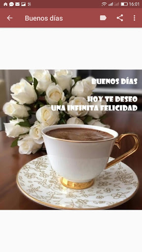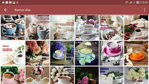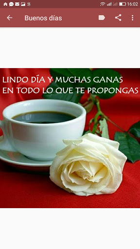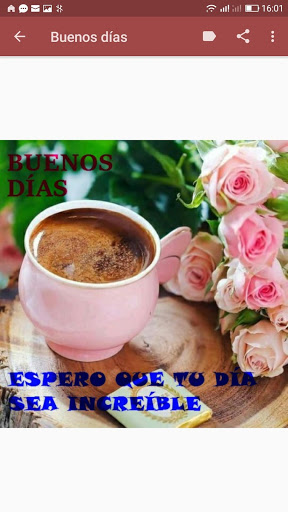 Hoy te quiero saludar con osito tierno, mañana te voy a saludar con una hermosa rosa, y en toda la semana te enviaré un café con una bella frase para que tu despertar sea diferente. Podemos mejorar nuestros lazos de amistad, podemos renovar nuestro compromiso con los demás, dibujar sonrisas, trasmitir fuerzas, todo con un saludo diseñado para generar alegrías, los buenos días son detalles que nunca se pueden perder, es por eso que desarrollamos aplicaciones con estas temáticas para reforzar y mantener la armonía entre todos, y para que con estos pequeños detalles, con la magia de un buenos días podamos enfrentar el reto diario. Ofrecemos una galería de postales con saludos en tres temáticas diferentes, puedes saludar con postales con ositos y niños, puedes dar los buenos días con postales y hermosos conjuntos de paisajes y café, puedes enviar una postal de buenos días con diferentes tipos de flores desde una rosa hasta un girasol, todas los saludos se pueden compartir a través de las redes sociales, abriendo la imagen en la parte superior derecha de tu smartphone en el icono enlace, se muestra la opción de compartir por diferentes medios o establecer como fondo. Es una aplicación que te ofrece un amplia colección de saludos y que puedes utilizar por el tiempo que quieras.