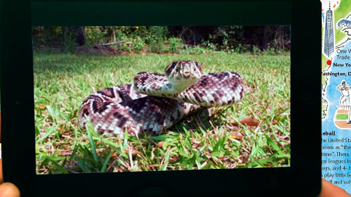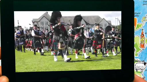 Launch "World in the Round" and scan the pictures. Touch the red pulsating buttons that appear on the screen of your tablet or smartphone. Sit back and enjoy the video clips (with or without background music).