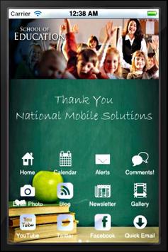 The App4Schools application is a demonstration of the many different features that an school or educational institution may have for information to students, faculty, administrators and parents. Informative features range from setting an appointment with faculty, school policy, lunch menus, emergency alerts, newsletters, class schedule, special events, take recorded notes for class and so much more. Have an administrator contact National Mobile Solutions for a customized mobile app for your school or institution.