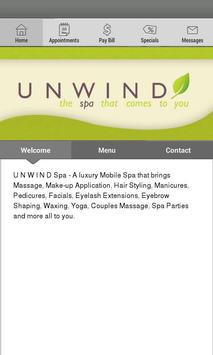 The U N W I N D Mobile Spa App is an easy-to-use, free mobile app created to stay informed and connected with us every day through a variety of great features. This fantastic interactive app provides you with the following innovative features: -Quick Contact- Quick contact features including click-to-call, map directions, and e-mail. -Share- Easy to share with Friends on Facebook & Twitter with a press of a button. - Deals/Coupons - Get exclusive Deals/Coupons via this app to save big daily. - In App Messaging - Use In-App Messaging to have real time communication with U N W I N D Mobile Spa including audio, text, and photo message capabilities.