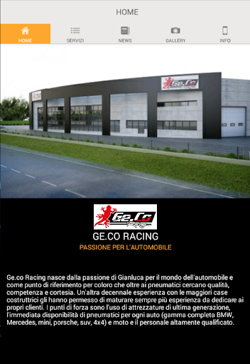 Ge.co Racing nasce dalla passione di Gianluca per il mondo dell'automobile e come un punto di riferimento per coloro che oltre ai pneumatici cercano qualità, competenza e cortesia. Una decennale esperienza con le maggiori case costruttrici gli hanno permesso di maturare una competenza di alta qualità da dedicare ai propri clienti. I punti di forza sono l'uso di attrezzature di ultima generazione, l'immediata disponibilità di pneumatici per ogni auto (gamma completa BMW, Mercedes, Mini, Porsche, SUV, 4x4) e moto e Personale altamente qualificato.