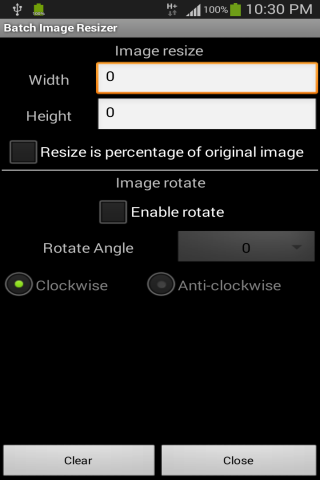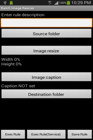 To configure, set the input folder (at least one), image resize width and height, output folder (one). Tap Execute Rule to start resizing those images fulfilling the criteria or tap Save Rule to save the configuration to be re-used later.