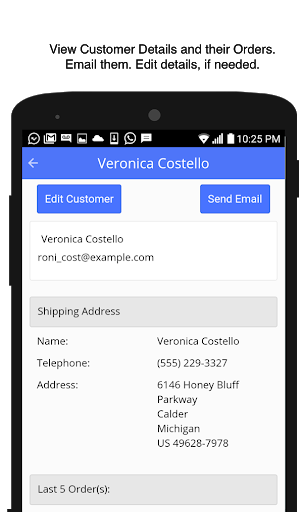 * Customer & customer details including email, billing and shipping address. View and update. Email customers right from the app.