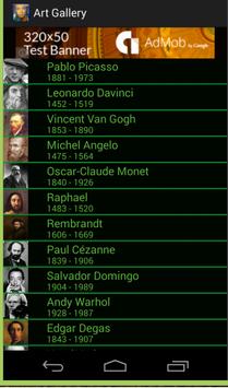 Pablo Picasso, Leonardo Davinci, Vincent Van Gogh, Michel Angelo, Oscar-Claude Monet, Raphael, Rembrandt, Paul Cézanne, Salvador Domingo, Andy Warhol,Edgar Degas, HenriMatisse, Caravaggio and Albert Bierstadt are displayed with a full image. Diversity of the skills of these famous artists are a significant feature and will interest the user.