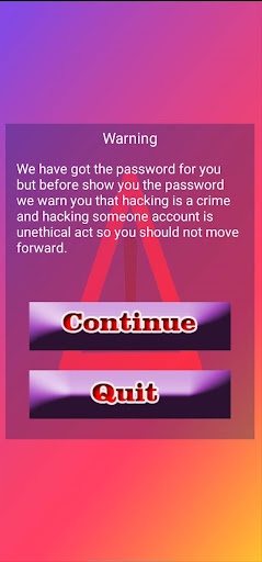„Instagram Hasło Hack Hack Prank”to aplikacja żart.Jest to symulator hakowania na Instagramie i udaje tylko, że włamuje się do zabezpieczonej sieci na Instagramie.Wszystkie hasła są losowo generowane i nie są prawdziwymi hasłami.Nie zhakujesz na żadnym pobliskim Instagramie za pomocą tego oprogramowania.