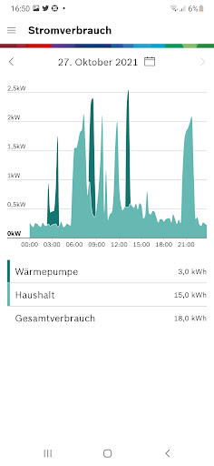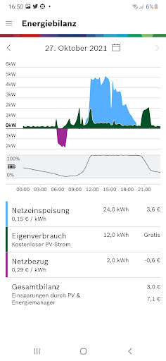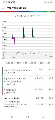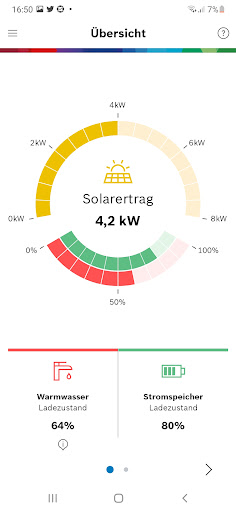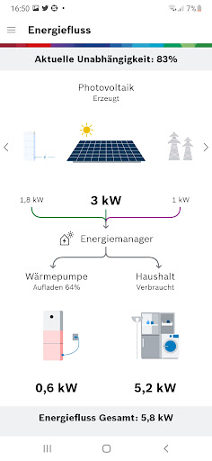 Pompa ciepła wykorzystuje opłacalną energię słoneczną do ogrzewania i ciepłej wody i jest włączony do modulowania, dostosowany do nadmiaru prądu PV. Pod koniec 2019 r.) lub urządzeń domowych Bosch. Zużycie we własnych czterech ścianach.