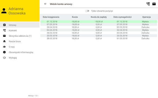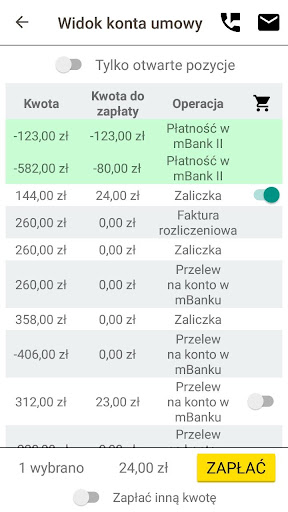 - podgląd informacji o rozliczeniach – saldo i zbliżające się płatności