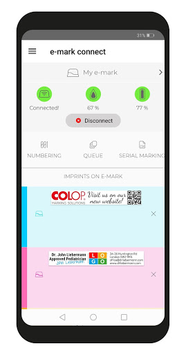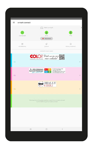 Colop E-Mark jest elektronicznym urządzeniem do znakowania. Dzięki aplikacji Colop E-Mark można łatwo tworzyć i zmienić wyroki w pełni kolory i wyślij je natychmiast do e-mark, gdziekolwiek i kiedy chcesz. Przeglądaj nową erę znakowania i tłoczenia.