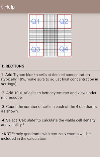 5. Help section that outlines the procedure for counting cells using Trypan Blue