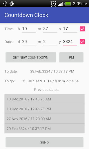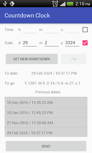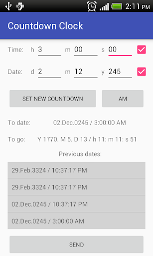 Calculates remaining and elapsed time to your date. Easy to use. Just check the checkbox and enter your date and time.
