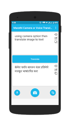 -> Marathi Camera & Voice Translator application can also be converted from one language to another by gallery, camera and your voice.