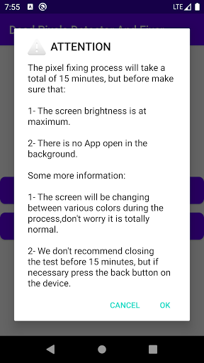 , jeśli wykryjesz zablokowane lub martwe piksele Będziesz mógł ich wyleczyć. Zapewnij łatwy sposób, aby naprawić utknął piksel. Program spróbuje użyć różnych środków do leczenia utknął pikseli. Działa również na wybór na ekranie. Zacznij i poczekaj na smartfonie lub tablecie tej aplikacji, aż umarli piksel lub utknął piksel został naprawiony lub usunięty.